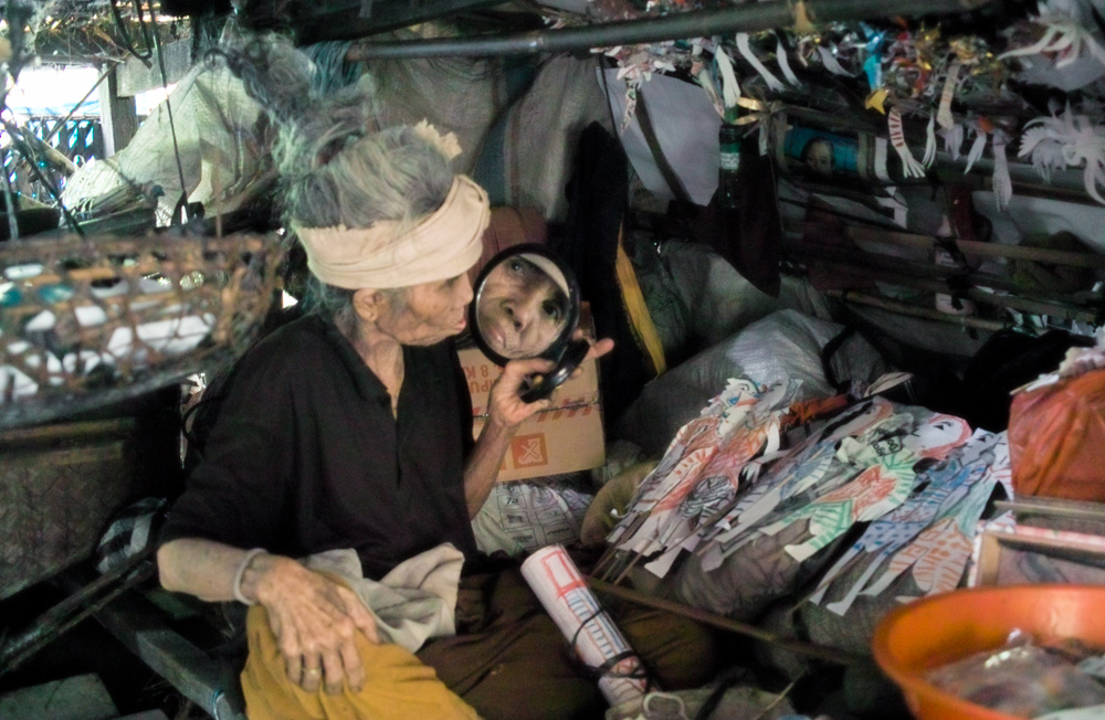 2010年、森の中にお婆さんを訪ねると病気で歩けない状態だった。それでも上半身を起こし、私がバリ語を解しないにもかかわらず、ずっと喋り続けた。帰り際に人形の列の中から花飾りを抜き取り手渡してくれた。
